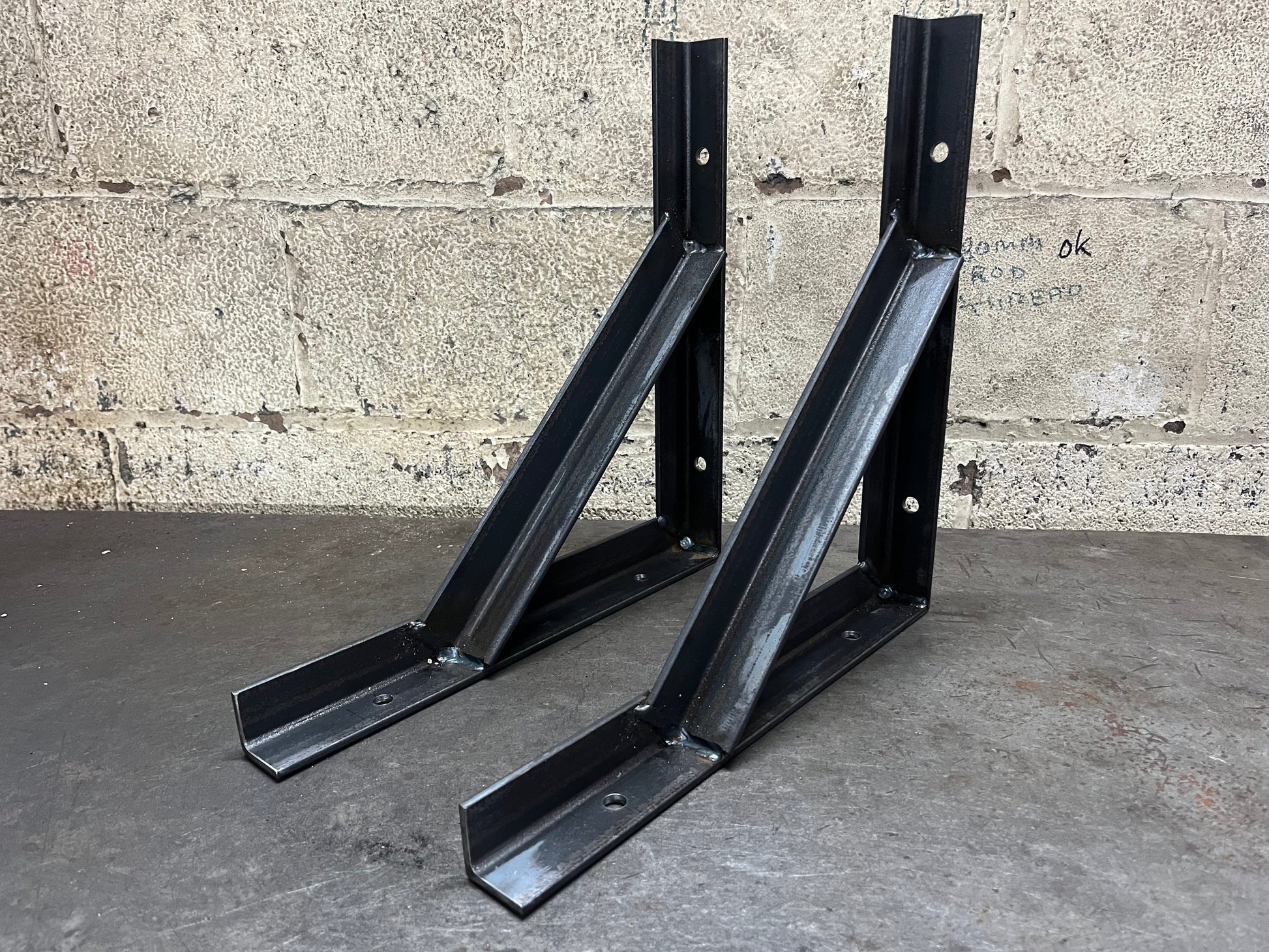 REALLY STRONG BRACKETS FOR HEAVY LOADS.Quick and economical way to create shelving. Support braces provides extra strength, guaranteeing the bracket will not bend. Made from high quality mild steel with a raw finish to provide a life time of trouble free use. Ideal for offices, garages, sheds, kitchens, warehouses.