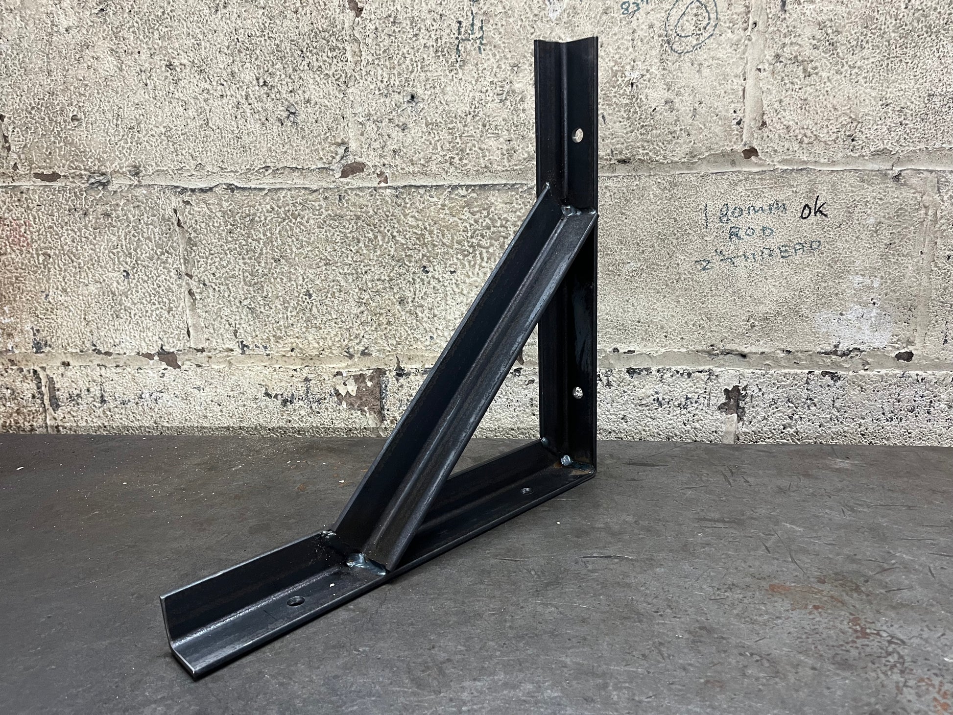 Made from angle iron mild steel 40x40mm. Inside brace is made from 40x40mm angle iron mild steel. Bracket is 5mm thick.